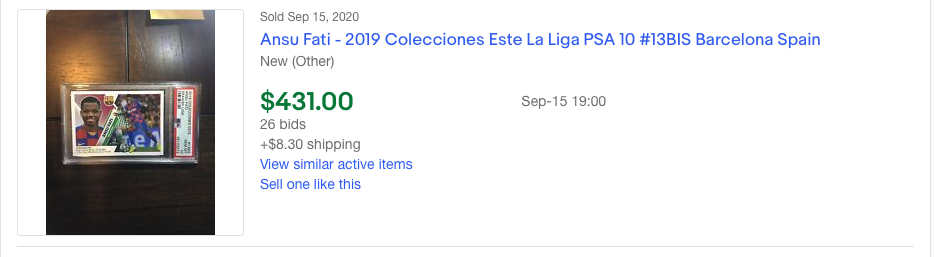 As for Ansu Fati, his PSA 10 2019 stickers are going for over $400+ and his PSA 10 Panini Megacracks cards are going for over $200+ RAW! And his stats? 24 out of 38 matches played in La Liga where he contributed 7 goals and 1 assist. You have got to be kidding me!