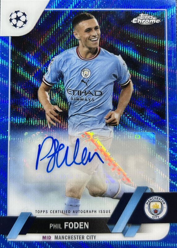 The top trending card in 2022 Topps Chrome UEFA Club Competitions is currently Phil Foden 2022 Topps Chrome UEFA Club Competitions #CA-PF Autographs - Blue Wave Refractor /75.