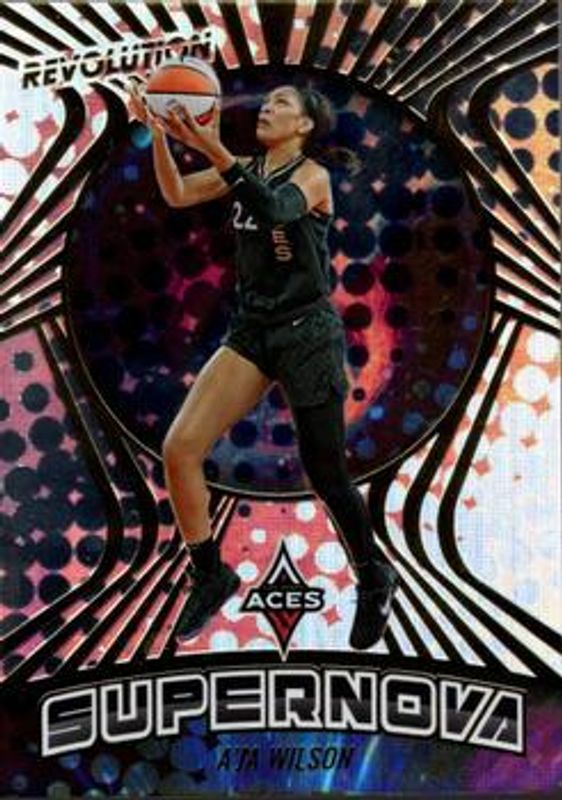 The A'ja Wilson 2022 Revolution WNBA #9 Supernova card is 1 of 31 A'ja Wilson's card variations in the 2022 Revolution WNBA set being tracked by Sports Card Investor, including Base, Astro, Fractal, Galactic, and Groove.
