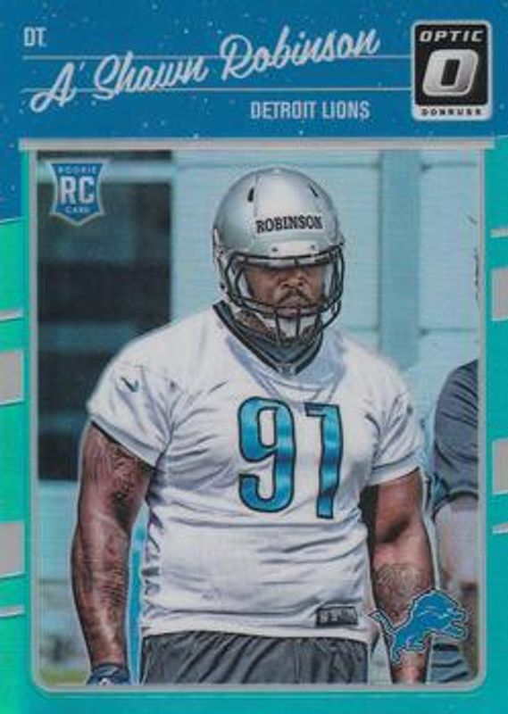 The A'Shawn Robinson 2016 Optic #104 Aqua /299 Rookie card is 1 of 24 A'Shawn Robinson's card variations in the 2016 Optic set being tracked by Sports Card Investor, including Base, Bronze, Holo, Pink, and Purple.