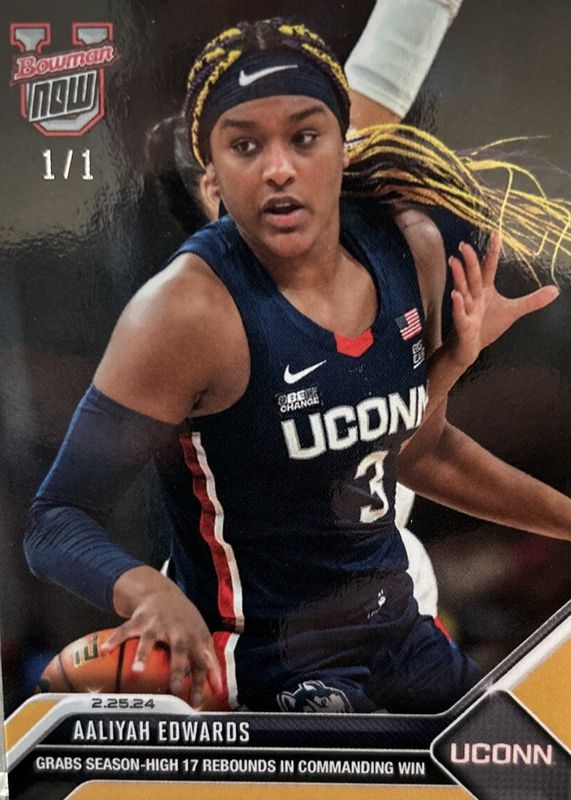 This card is 1 of 6 Aaliyah Edwards' card variations in the 2023 Bowman U Now set being tracked by Sports Card Investor, including Base (Print Run: 301), Blue /49, Purple /25, Red /10, and Orange /5.