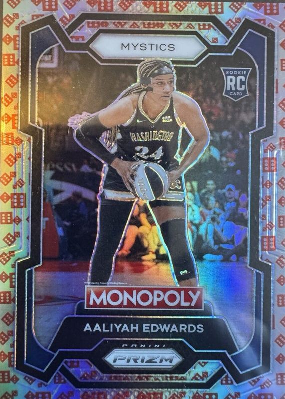 The Aaliyah Edwards 2024 Prizm Monopoly WNBA #13 Dice Rookie card in Raw condition has not changed in price in the last 30 days and was last sold for $9.99 .