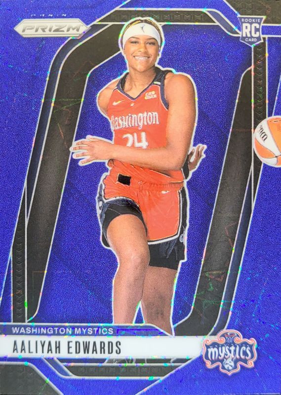 The Aaliyah Edwards 2024 Prizm WNBA #142 Blue Velocity Rookie card is 1 of 131 Aaliyah Edwards' card variations in the 2024 Prizm WNBA set being tracked by Sports Card Investor, including #142 Base, #70 Base, #142 Rookie Variation, #70 Blue Velocity, and #70 Checkerboard.