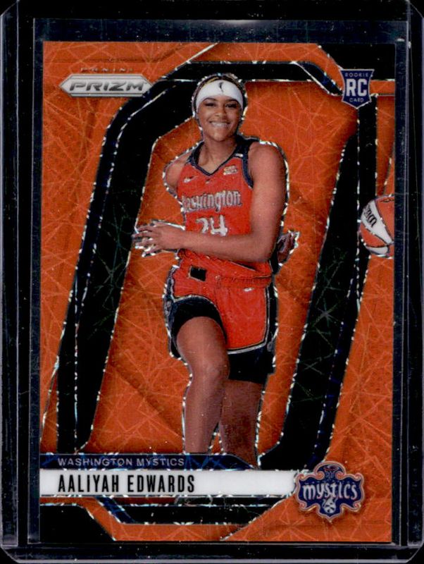 The Aaliyah Edwards 2024 Prizm WNBA #142 Orange Velocity Rookie card is 1 of 131 Aaliyah Edwards' card variations in the 2024 Prizm WNBA set being tracked by Sports Card Investor, including #142 Base, #70 Base, #142 Rookie Variation, #142 Blue Velocity, and #70 Blue Velocity.