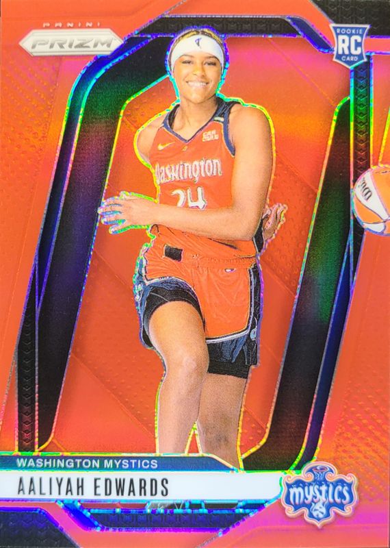 The Aaliyah Edwards 2024 Prizm WNBA #142 Red /299 Rookie card is 1 of 131 Aaliyah Edwards' card variations in the 2024 Prizm WNBA set being tracked by Sports Card Investor, including #142 Base, #70 Base, #142 Rookie Variation, #142 Blue Velocity, and #70 Blue Velocity.