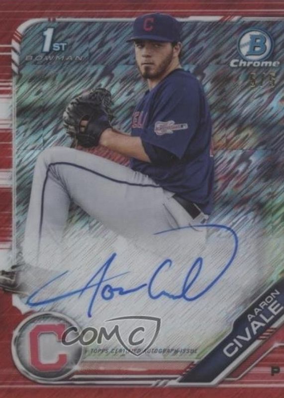 Aaron Civale's Baseball cards are available in at least 18 sets. Aaron Civale's biggest 7-day price movers are 2020 Topps Chrome #RA-AC Rookie Auto, 2019 Bowman #CPA-AC Chrome Prospect Auto - Red Shimmer Refractor /5 (1st), and 2021 Topps Inception #RESA-AC Rookie & Emerging Star Autographs - Magenta /99.