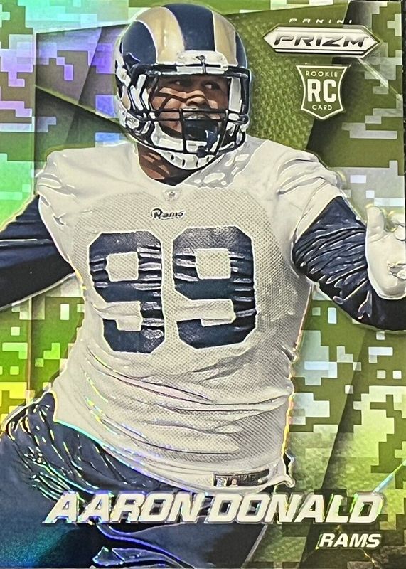The Aaron Donald 2014 Prizm #228 Camo Rookie card in Raw condition has not changed in price in the last 30 days and was last sold for $41.60 .