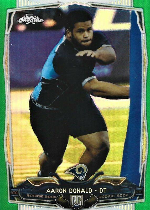 The Aaron Donald 2014 Topps Chrome #175 Green Refractor Rookie card in Raw condition has moved down -$1.00 (-7.7%) in the last 30 days and was last sold for $11.99 .