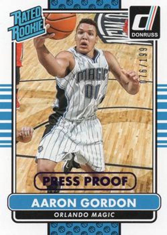 The Aaron Gordon 2014 Donruss #209 Press Proofs Purple /199 Rookie card is 1 of 28 Aaron Gordon's card variations in the 2014 Donruss set being tracked by Sports Card Investor, including Base, Swirlorama, Press Proofs Blue /99, Press Proofs Silver /25, and Press Proofs Gold /10.