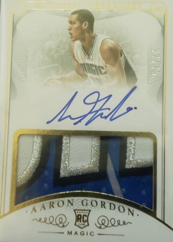 This card is 1 of 5 Aaron Gordon's card variations in the 2014 National Treasures set being tracked by Sports Card Investor, including Rookie Patch Auto /99, Rookie Patch Auto - Platinum /5, Rookie Patch Auto Horizontal /10, and Rookie Patch Auto Horizontal - Logoman /1.