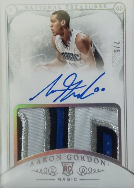 This card is 1 of 5 Aaron Gordon's card variations in the 2014 National Treasures set being tracked by Sports Card Investor, including Rookie Patch Auto /99, Rookie Patch Auto - Gold /25, Rookie Patch Auto Horizontal /10, and Rookie Patch Auto Horizontal - Logoman /1.
