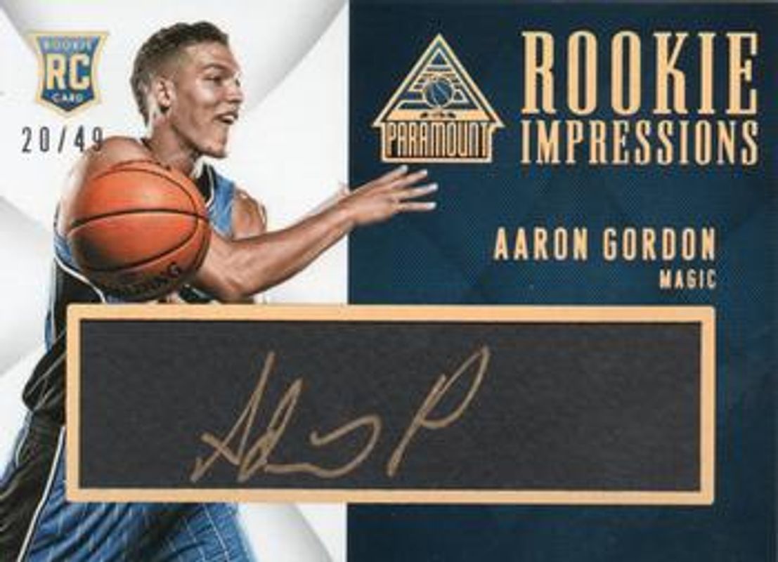 The Aaron Gordon 2014 Paramount #1 Rookie Impressions Autographs /49 card is 1 of 18 Aaron Gordon's card variations in the 2014 Paramount set being tracked by Sports Card Investor, including #29 Base /25, #79 Base /25, #29 Bronze /50, #29 Blue /25, and #29 Gold /10.