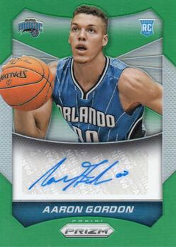 The Aaron Gordon 2014 Prizm #82 Autographs - Green Rookie card is 1 of 42 Aaron Gordon's card variations in the 2014 Prizm set being tracked by Sports Card Investor, including Base, Blue Green Mosaic, Blue Mojo, Blue Wave, and Green.