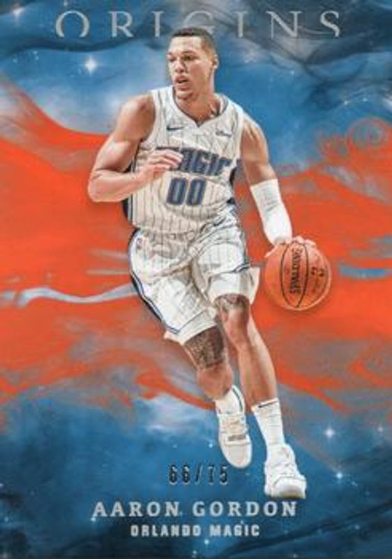 The Aaron Gordon 2019 Origins #68 Orange /75 card is 1 of 17 Aaron Gordon's card variations in the 2019 Origins set being tracked by Sports Card Investor, including Base, Red, Blue /99, Pink /35, and Turquoise /25.