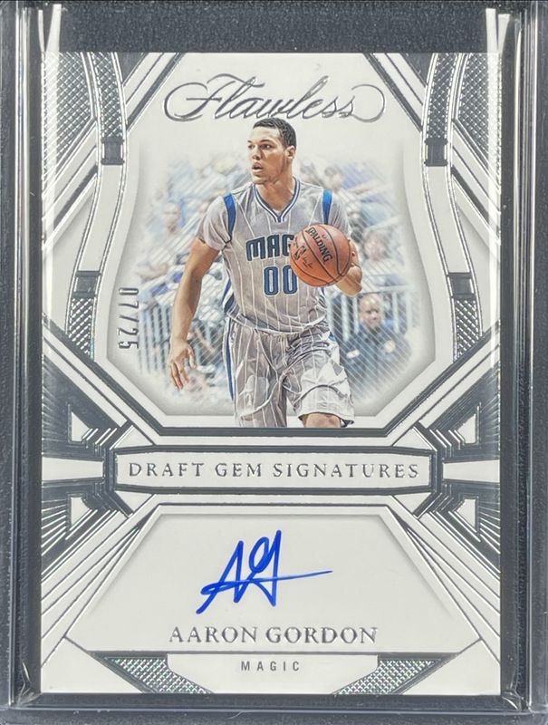 The Aaron Gordon 2023 Flawless #DGS-AAG Draft Gem Signatures /25 card is 1 of 29 Aaron Gordon's card variations in the 2023 Flawless set being tracked by Sports Card Investor, including Flawless Frame Signatures /25, Flawless Shade Signatures /25, Horizontal Patch Autographs /25, Draft Gem Signatures - Ruby /15, and Flawless Frame Signatures - Ruby /15.
