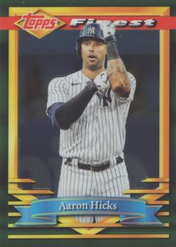 The Aaron Hicks 2021 Topps Finest Flashbacks #187 Base card is 1 of 7 Aaron Hicks' card variations in the 2021 Topps Finest Flashbacks set being tracked by Sports Card Investor, including Refractor, Gold Refractor /50, Prism Refractor /35, Black Refractor /25, and Red Refractor /5.