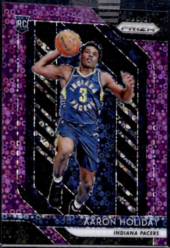 The Aaron Holiday 2018 Prizm #114 Fast Break Purple /75 Rookie card is 1 of 58 Aaron Holiday's card variations in the 2018 Prizm set being tracked by Sports Card Investor, including Base, Choice Blue Yellow Green, Fast Break, Green, and Pink Ice.