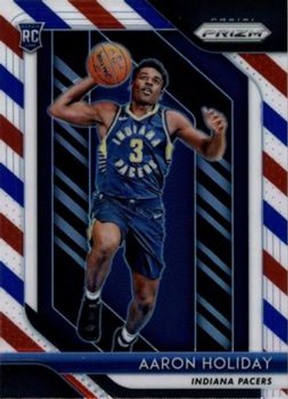The Aaron Holiday 2018 Prizm #114 Red White Blue Rookie card is 1 of 58 Aaron Holiday's card variations in the 2018 Prizm set being tracked by Sports Card Investor, including Base, Choice Blue Yellow Green, Fast Break, Green, and Pink Ice.