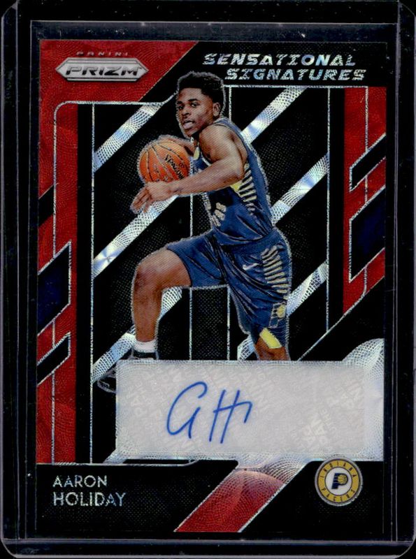 The Aaron Holiday 2018 Prizm #SS-AHD Sensational Signatures - Choice Rookie card is 1 of 58 Aaron Holiday's card variations in the 2018 Prizm set being tracked by Sports Card Investor, including Base, Choice Blue Yellow Green, Fast Break, Green, and Pink Ice.