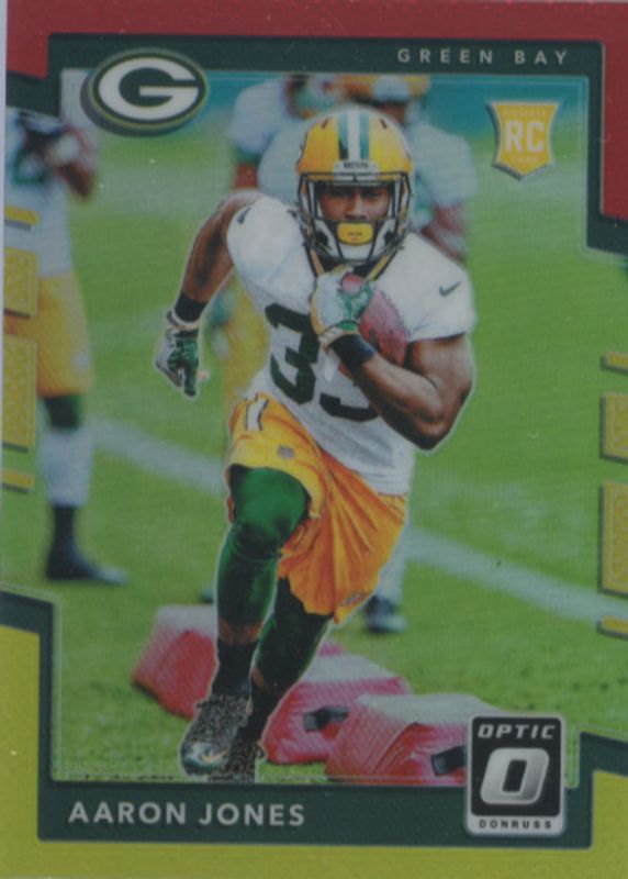 The Aaron Jones Sr. 2017 Optic #135 Red & Yellow Rookie card in Raw condition has moved up $1.25 (+62.5%) in the last 30 days and was last sold for $3.25 .
