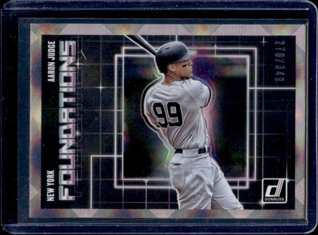The Aaron Judge 2018 Donruss #F2 Foundations - Silver /349 card is 1 of 69 Aaron Judge's card variations in the 2018 Donruss set being tracked by Sports Card Investor, including #148 Base, #253b Base, #253 Base, #19 Diamond Kings, and Blank Back.