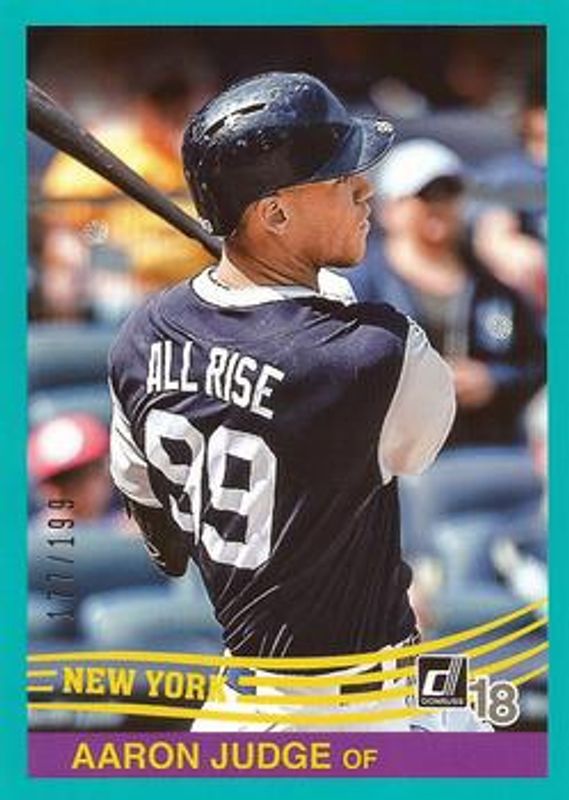 The Aaron Judge 2018 Donruss #253 Teal /199 card is 1 of 69 Aaron Judge's card variations in the 2018 Donruss set being tracked by Sports Card Investor, including #148 Base, #253b Base, #253 Base, #19 Diamond Kings, and Blank Back.