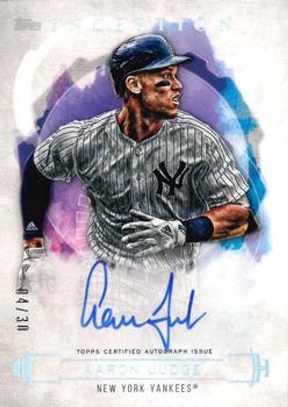 The Aaron Judge 2019 Topps Inception #RES-AJ Rookies & Emerging Stars Autographs /250 card is 1 of 38 Aaron Judge's card variations in the 2019 Topps Inception set being tracked by Sports Card Investor, including Base, Green, Purple /150, Magenta /99, and Red /75.