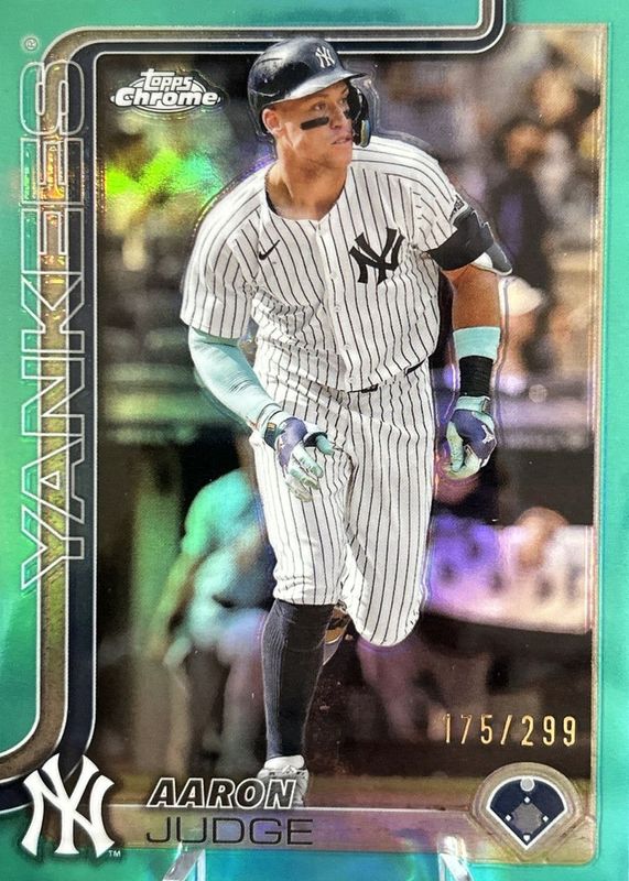 The Aaron Judge 2025 Topps Chrome #99 Teal Refractor /299 card in Raw condition has moved down -$15.00 (-30.0%) in the last 30 days and was last sold for $35.00 .
