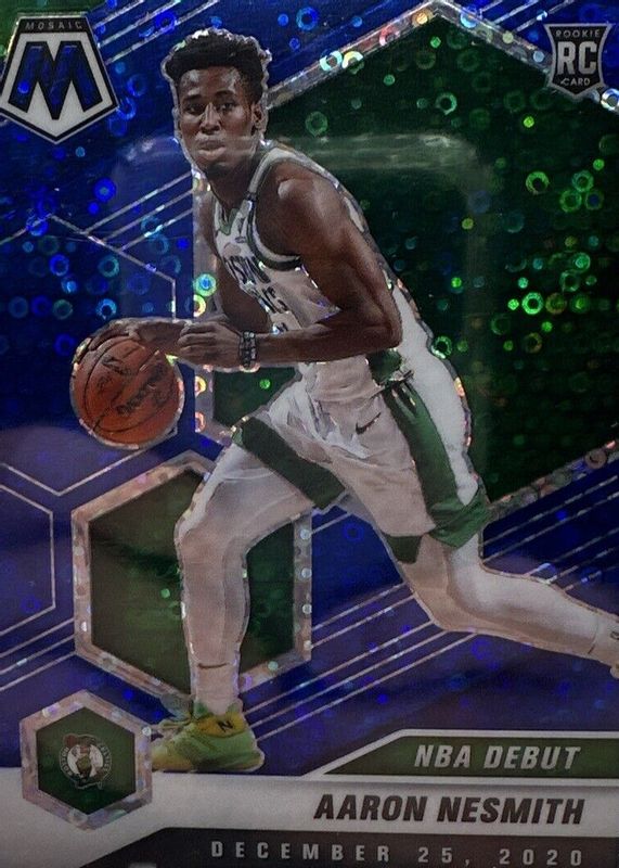 The Aaron Nesmith 2020 Mosaic #279 NBA Debut - Fast Break Blue /85 Rookie card in Raw condition has not changed in price in the last 30 days and was last sold for $5.00 .