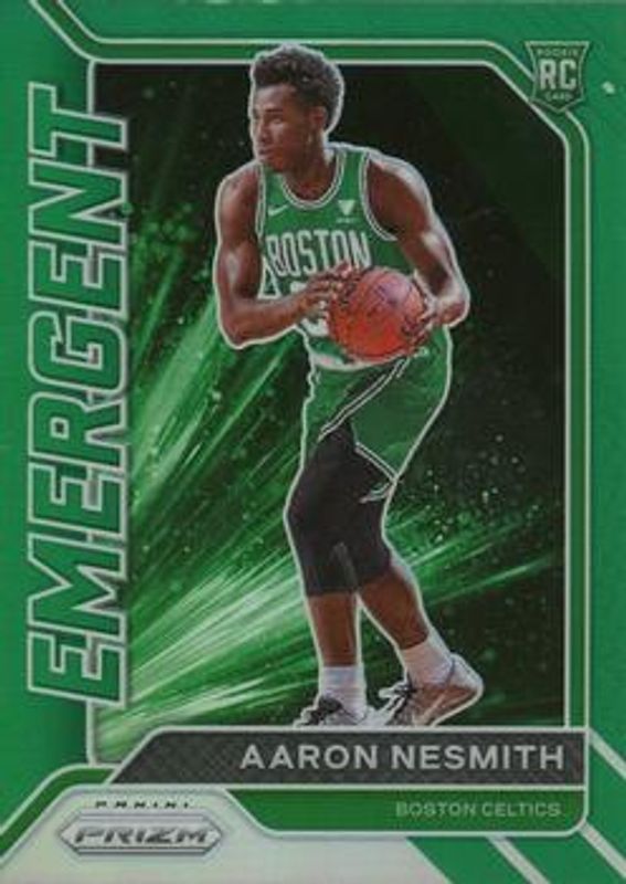 The Aaron Nesmith 2020 Prizm #11 Emergent - Green Rookie card is 1 of 78 Aaron Nesmith's card variations in the 2020 Prizm set being tracked by Sports Card Investor, including #282 Base, #282b Base, #282 Choice Blue Yellow Green, #282 Fast Break, and #282b Fast Break.