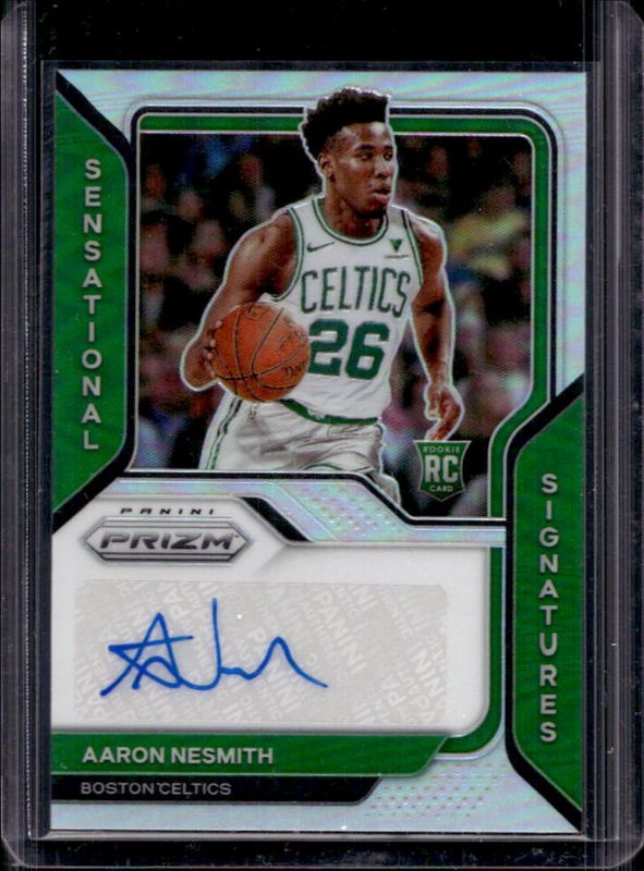 The Aaron Nesmith 2020 Prizm #SS-ANS Sensational Signatures - Silver Rookie card is 1 of 78 Aaron Nesmith's card variations in the 2020 Prizm set being tracked by Sports Card Investor, including #282 Base, #282b Base, #282 Choice Blue Yellow Green, #282 Fast Break, and #282b Fast Break.
