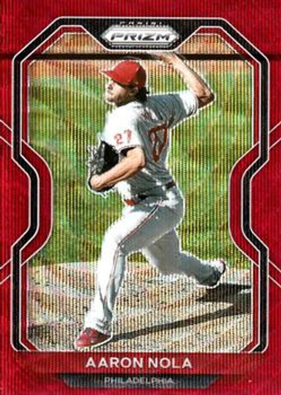 The Aaron Nola 2021 Prizm #147 Red Wave /99 card is 1 of 43 Aaron Nola's card variations in the 2021 Prizm set being tracked by Sports Card Investor, including Base, Blue, Blue Velocity, Carolina Blue, and Cosmic Haze.