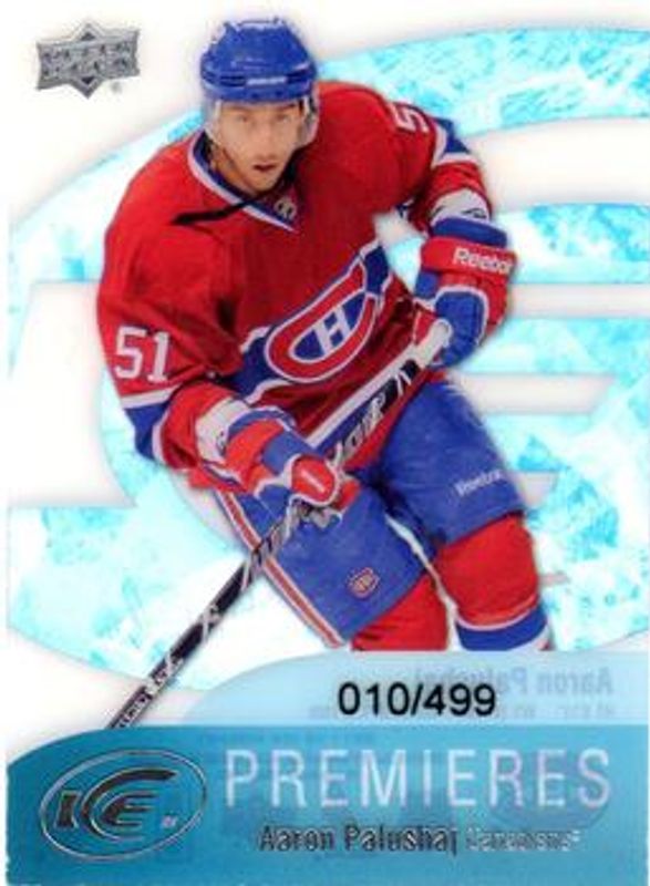 The Aaron Palushaj 2011 Upper Deck Black Diamond #78 2011 Upper Deck Ice /1999 Rookie card is 1 of 5 Aaron Palushaj's card variations in the 2011 Upper Deck Black Diamond set being tracked by Sports Card Investor, including Base, Ruby /100, Gold /10, and Platinum /1.