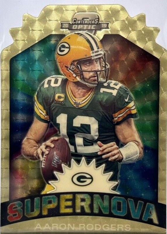 The Aaron Rodgers 2019 Contenders Optic #S-AR Supernova - Gold Vinyl /1 card in Raw condition has not changed in price in the last 30 days and was last sold for $623.00 .