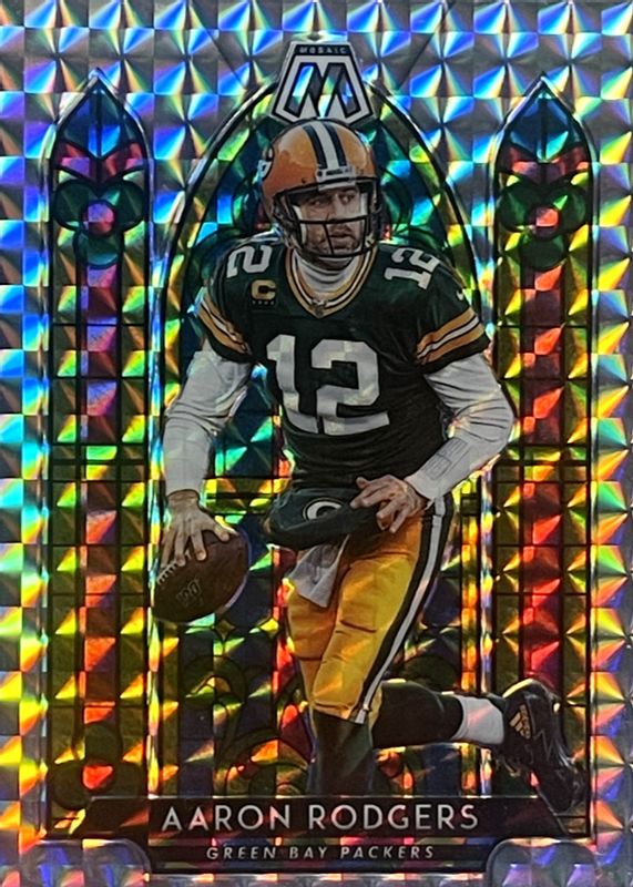 The Aaron Rodgers 2020 Mosaic #SG6 Stained Glass /(SSP) card in Raw condition has moved down -$4.00 (-5.7%) in the last 30 days and was last sold for $66.00 .