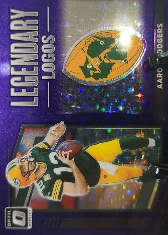 The Aaron Rodgers 2021 Optic #LL-8 Legendary Logos - Purple Stars /25 card in Raw condition has not changed in price in the last 30 days and was last sold for $57.75 .