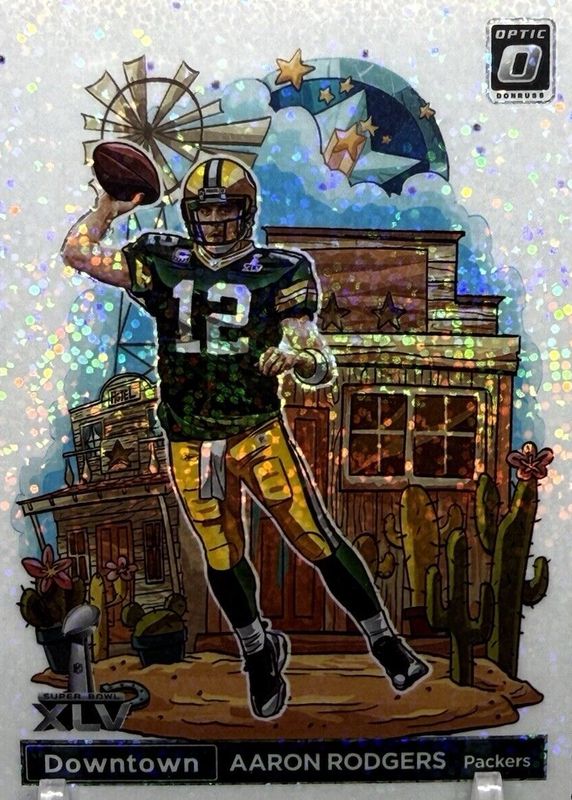 The Aaron Rodgers 2022 Optic #DT-AR Downtown - White Sparkle /1 card in Raw condition has not changed in price in the last 30 days and was last sold for $3,050.00 .