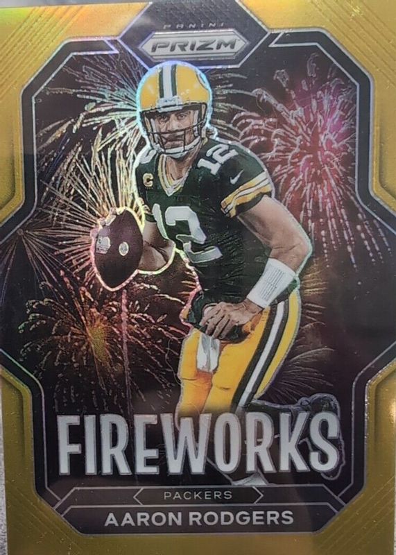 The Aaron Rodgers 2022 Prizm #F-1 Fireworks - Gold /10 card in Raw condition has not changed in price in the last 30 days and was last sold for $57.00 .