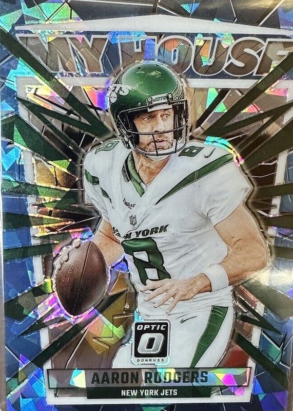 The Aaron Rodgers 2023 Optic #2 My House - Ice /15 card in Raw condition has not changed in price in the last 30 days and was last sold for $23.99 .