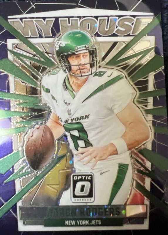 Aaron Rodgers 2023 Donruss Optic FOTL Purple My House 9/25. Ny Jets