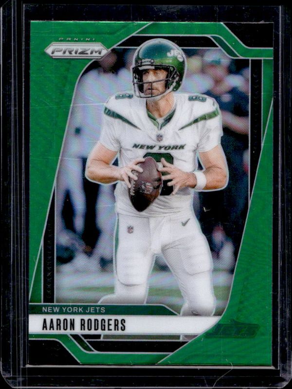 The Aaron Rodgers 2024 Prizm #222 Green card is 1 of 84 Aaron Rodgers' card variations in the 2024 Prizm set being tracked by Sports Card Investor, including Base, Choice Blue Yellow Green, Choice Silver, Disco, and Green Ice.