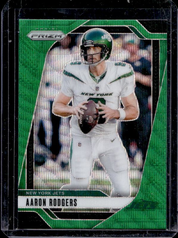 The Aaron Rodgers 2024 Prizm #222 Green Wave card is 1 of 84 Aaron Rodgers' card variations in the 2024 Prizm set being tracked by Sports Card Investor, including Base, Choice Blue Yellow Green, Choice Silver, Disco, and Green.