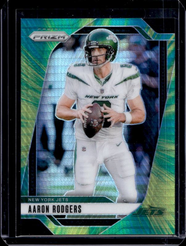 The Aaron Rodgers 2024 Prizm #222 Hyper /180 card is 1 of 84 Aaron Rodgers' card variations in the 2024 Prizm set being tracked by Sports Card Investor, including Base, Choice Blue Yellow Green, Choice Silver, Disco, and Green.