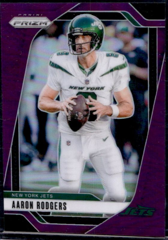 The Aaron Rodgers 2024 Prizm #222 Purple /125 card is 1 of 84 Aaron Rodgers' card variations in the 2024 Prizm set being tracked by Sports Card Investor, including Base, Choice Blue Yellow Green, Choice Silver, Disco, and Green.