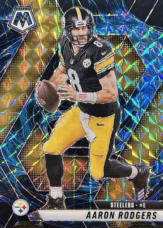 This card is 1 of 4 Aaron Rodgers' card variations in the 2025 Mosaic set being tracked by Sports Card Investor, including Choice Peacock /(SSP), Honeycomb /(SSP), and White Sparkle /(SSP).