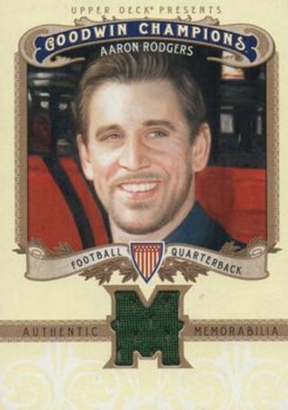 The Aaron Rodgers 2012 Upper Deck Goodwin Champions #M-AR Memorabilia card is 1 of 12 Aaron Rodgers' card variations in the 2012 Upper Deck Goodwin Champions set being tracked by Sports Card Investor, including Base, Mini, Mini Foil, Mini Green, and Mini Green Blank Backs.