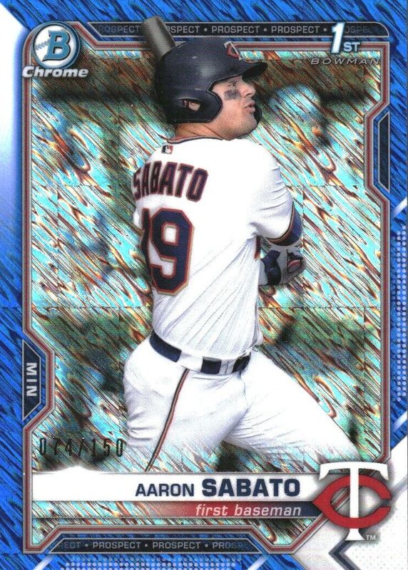 The Aaron Sabato 2021 Bowman #BCP-125 Chrome Prospects - Blue Shimmer Refractor /150 (1st) card in Raw condition has not changed in price in the last 30 days and was last sold for $2.70 .