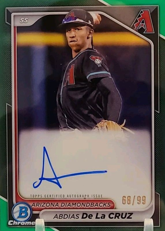 This card is 1 of 25 Abdias De La Cruz's card variations in the 2024 Bowman Chrome set being tracked by Sports Card Investor, including Prospect Auto, Prospect Auto - Refractor /499, Prospect Auto - Speckle Refractor /299, Prospect Auto - Purple Refractor /250, and Prospect Auto - Blue RayWave Refractor /150.