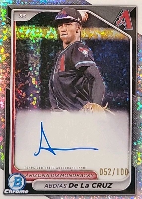 This card is 1 of 25 Abdias De La Cruz's card variations in the 2024 Bowman Chrome set being tracked by Sports Card Investor, including Prospect Auto, Prospect Auto - Refractor /499, Prospect Auto - Speckle Refractor /299, Prospect Auto - Purple Refractor /250, and Prospect Auto - Blue RayWave Refractor /150.