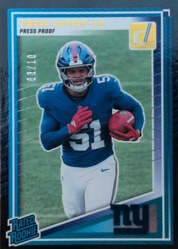The Abdul Carter 2025 Donruss #315 Press Proof Black /10 Rookie card in Raw condition has not changed in price in the last 30 days and was last sold for $32.50 .